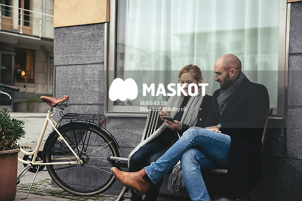Medarbetare använder smartphone på bänk utanför hus