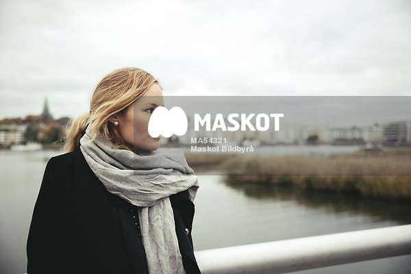 Fundersam kvinna med vinterkläder står på bro