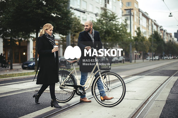 Kollegor med cykel går över spårvagnsräls i stad