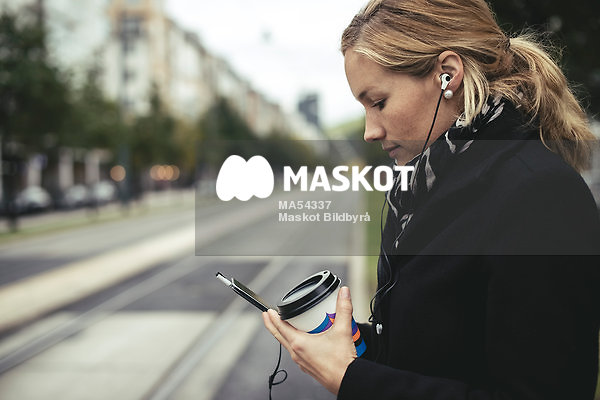 Kvinna med hörlurar och take away-mugg står vid räls