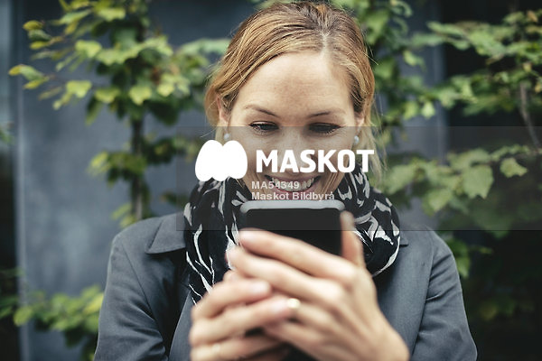 Leende affärskvinna tittar på smartphone