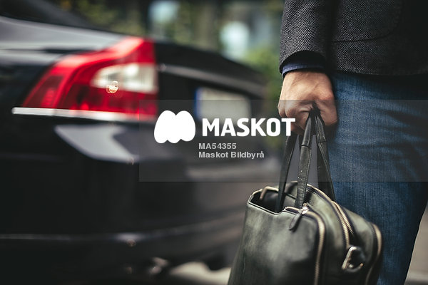 Välklädd man bär portfölj bredvid bil