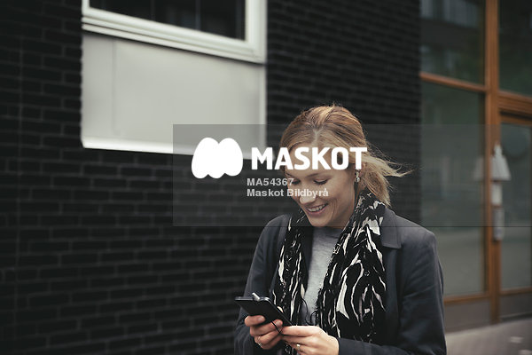 Glad kvinna använder mobiltelefon och lyssnar på musik i hörlurar