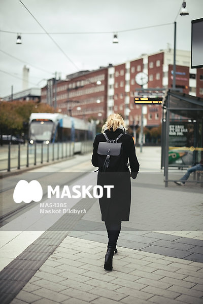 Kvinna i vinterkläder går på spårvagnsstation