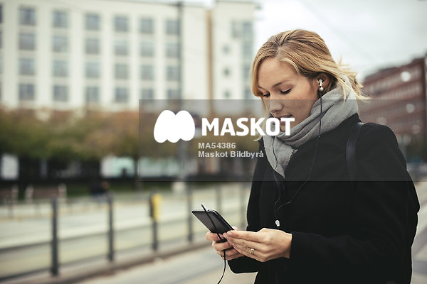 Affärskvinna lyssnar på musik på spårvagnsstation