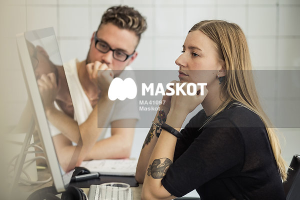 Fundersamma och eftertänksamma medarbetare vid dator på kontor