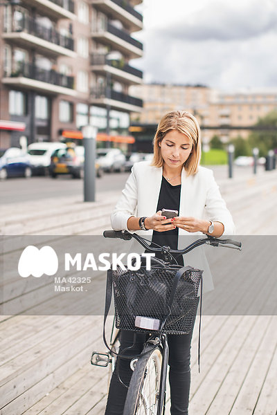 Affärskvinna skriver på telefon lutad mot cykelstyre