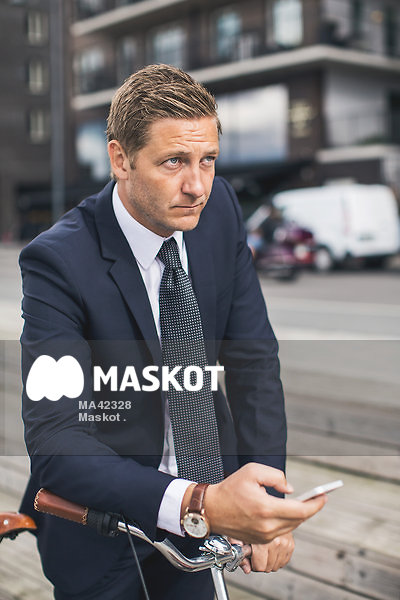Affärsman tittar bort med telefon i hand, lutad över cykel