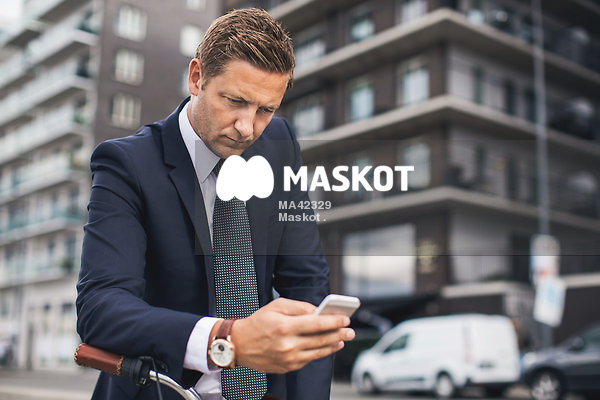 Affärsman lutar sig över cykelstyre och skriver på telefon