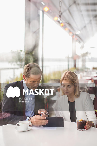 Kvinna och man tittar på surfplatta tillsammans på restaurang