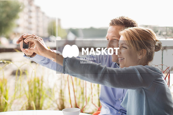 Glad affärskvinna och affärsman tar selfie under möte på uteservering