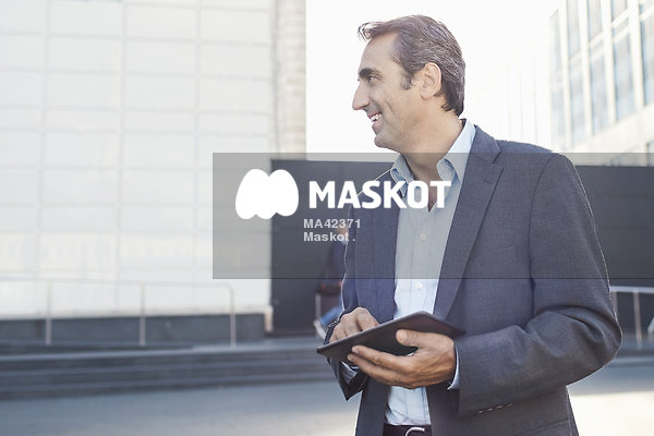 Leende man i kostym med surfplatta utanför kontorsbyggnad
