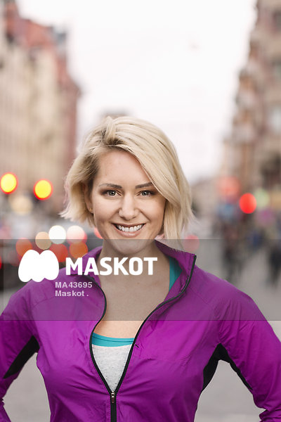 Porträtt av kvinna i träningskläder i stadsmiljö