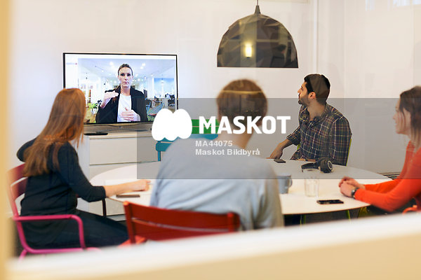 Kollegor på kreativt företag deltar i videosamtal under möte i konferensrum