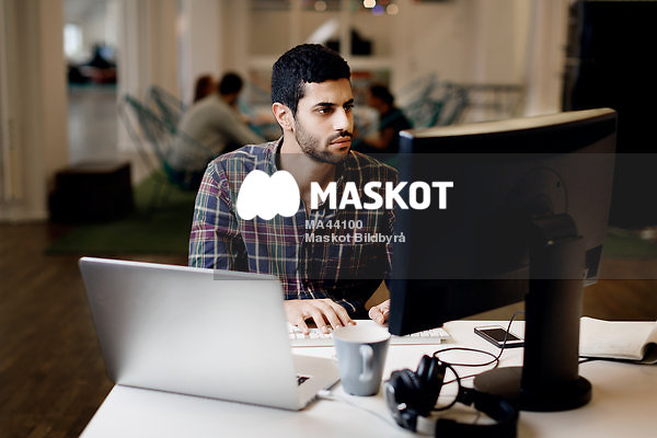Ung man arbetar sent på kvällen med datorer på kreativt kontor
