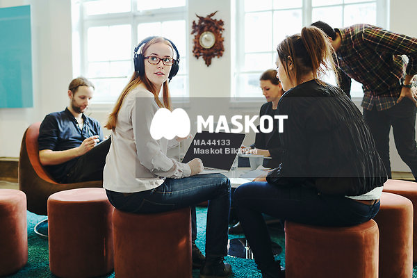 Kollega med hörlurar tittar åt sidan på kreativt kontor