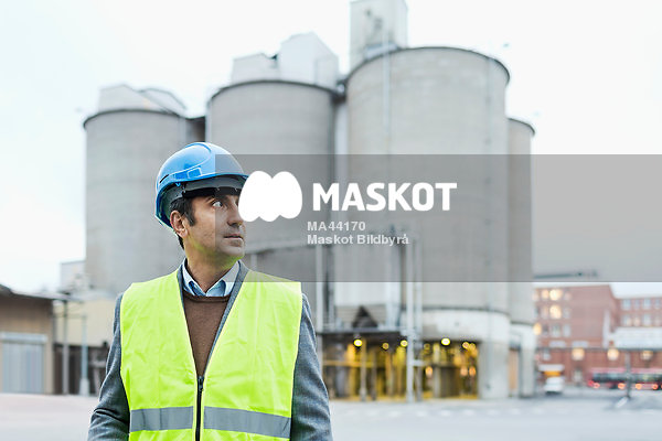 Man står framför cementsilos i skyddskläder och tittar åt sidan