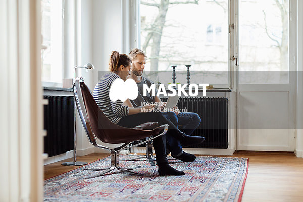 Par sitter i fåtöljer och handlar med kreditkort på nätet