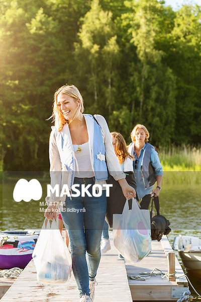 Tre vänner går på brygga med packning
