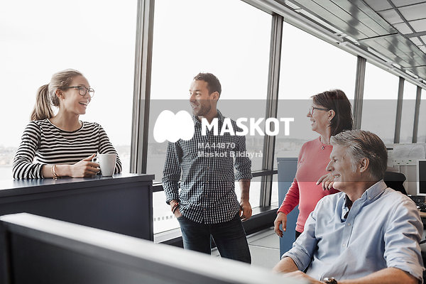Glada kollegor vid skrivbord på arbetsplats