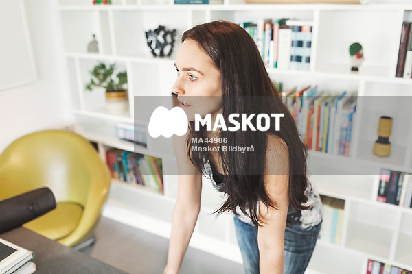 Kvinna i profil som lutar sig mot skrivbord hemma