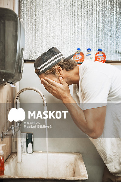 Snickare tvättar ansiktet i verkstad