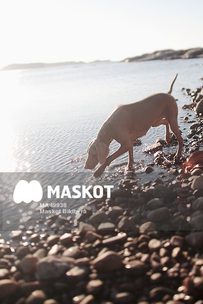 Weimaraner på stenig strand under solig dag