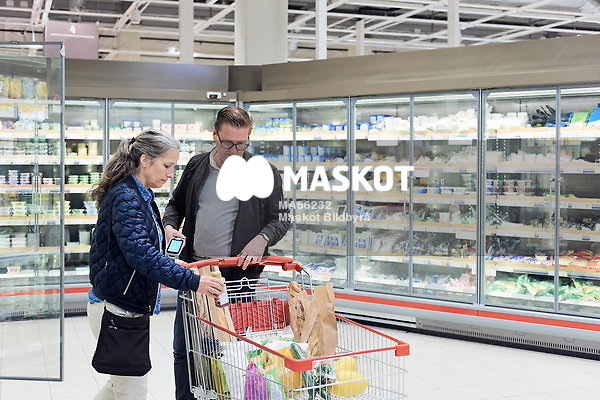 Kvinna lägger ner vara i kundvagn medan man tittar på