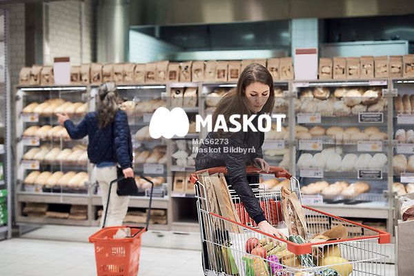 Kvinna lägger bananer i kundvagn i mataffär