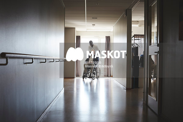 Sjuksköterska kör äldre man i rullstol i korridor på äldreboende
