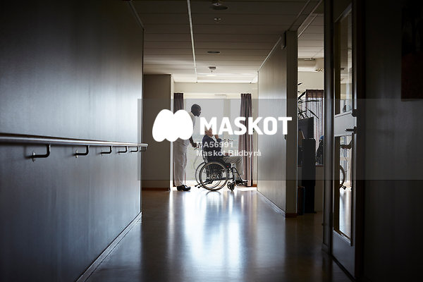 Vårdgivare kör äldre man i rullstol på sjukhus