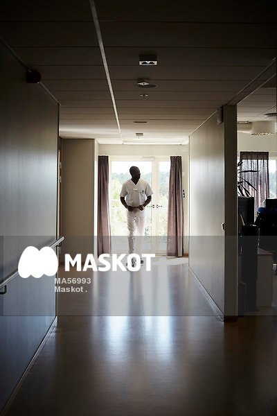 Manlig sjuksköterska med läsplatta går i sjukhuskorridor