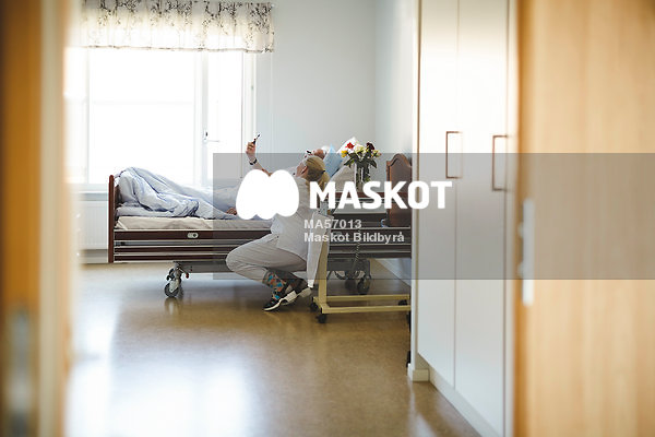 Äldre man tar selfie med sjuksköterska på äldreboende