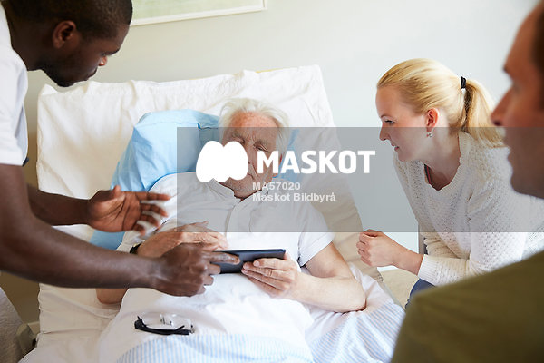 Manlig sjuksköterska visar läsplatta för äldre man medan dotter hälsar på