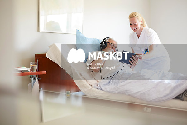 Glad sjuksköterska och äldre man tittar på läsplatta tillsammans