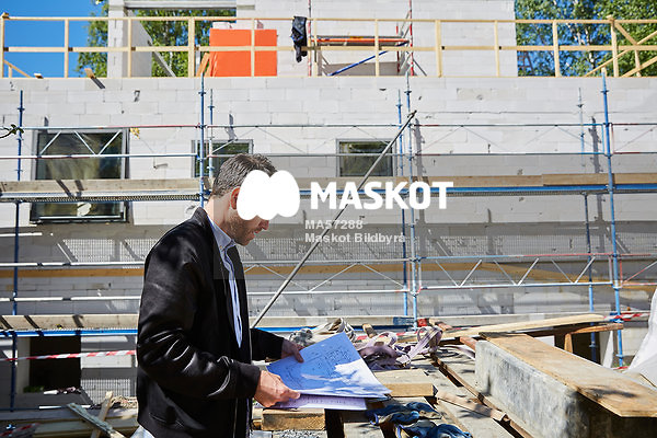Arkitekt står vid arbetsbänk och undersöker husritning