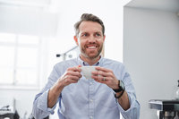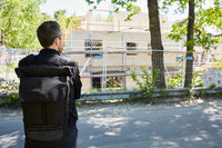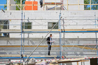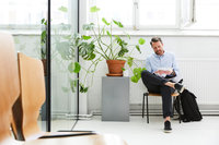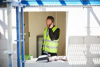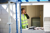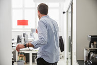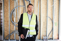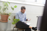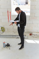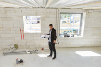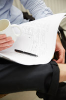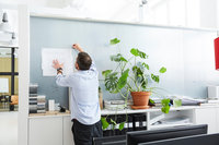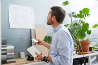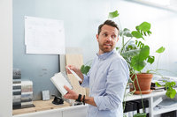Arkitekt arbetar vid skrivbord på ljust kontor