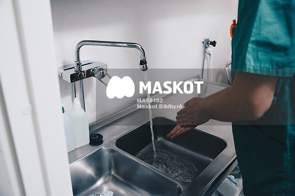 Manlig sjuksköterska tvättar händerna i diskho