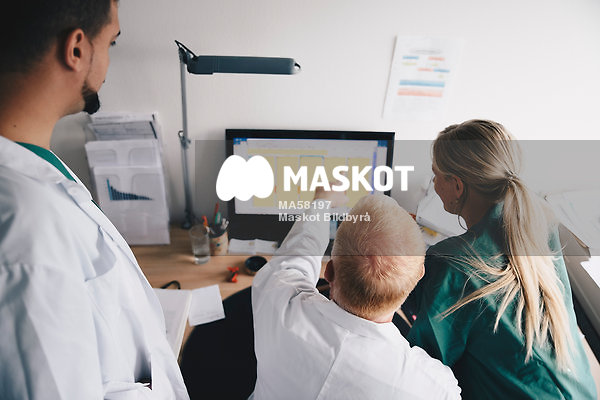 Läkare och sjuksköterska diskuterar vid dator på kontor