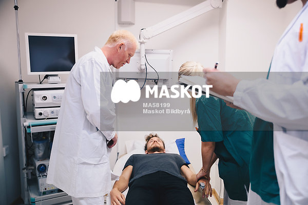 Ung patient ligger på sjukhusbrits medan läkare undersöker honom