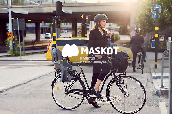 Kvinna står med cykel vid övergångsställe och väntar på grönt ljus
