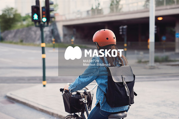 Kvinna cyklar på gata i stad