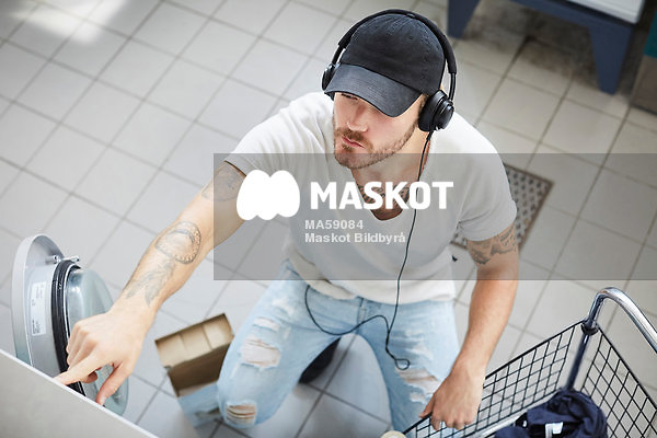 Ung student lyssnar på musik och tvättar kläder i tvättstuga