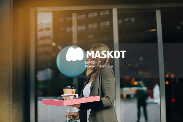 Leende kvinna pratar i mobiltelefon och bär take away-lunch