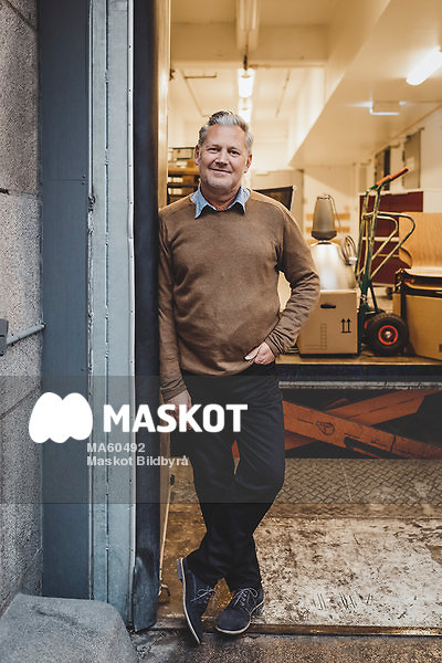 Porträtt av medelålders man med handen i fickan framför dörröppning till kontorbyggnad