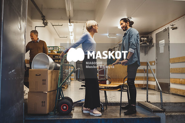 Kvinna och man diskuterar under flytt in i nytt kontor