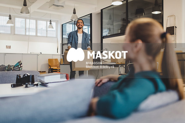 Leende man bär flyttkartong medan kvinna sitter i soffa