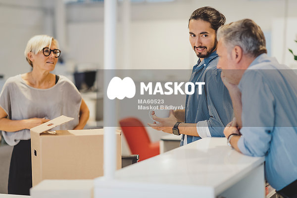 Kollegor står vid skåp och diskuterar på nytt kontor