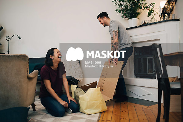 Skrattande par packar upp flyttkartonger i vardagsrum