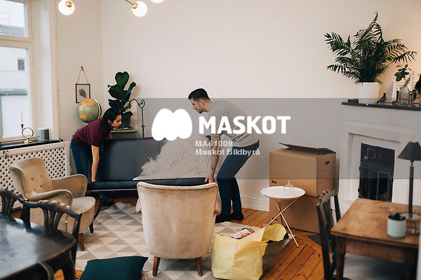 Kvinna och man hjälps åt att flytta soffa i vardagsrum